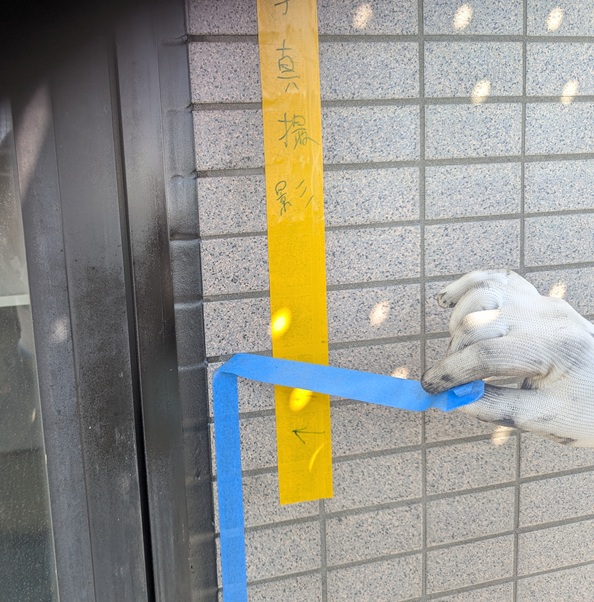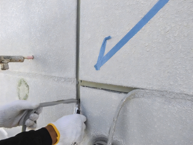 右の写真では、充填後のシーリング材をヘラでならし、マスキングテープを剥がして仕上げを行っている様子です。防水性と美観を両立させるため、細部まで丁寧な作業を心がけています。