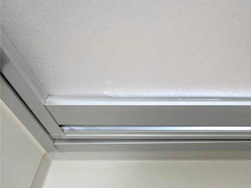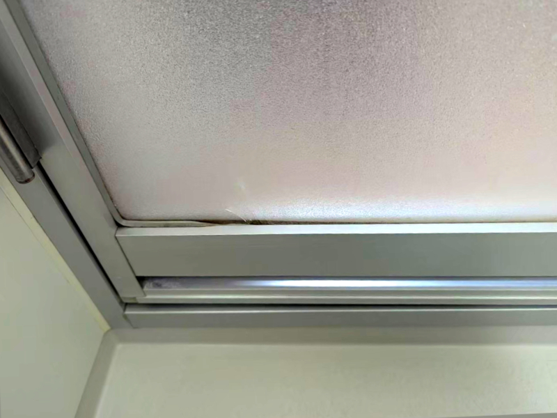 この写真は、札幌市内の一般住宅にて行った浴室ドアまわりの改修工事の様子を記録したものです。長年の使用で劣化したパッキンやシリコンゴムを丁寧に除去し、新しいシーリング材で美しく仕上げることで、清潔感と防水性をよみがえらせました。